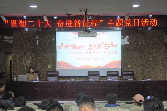 在第三部分,袁红梅分享了“我所经历的二十大”,她根据亲身经历,饱含深情地讲述了自己参与党的二十大全过程,深感责任重大、使命光荣。她号召学校教育工作者要将中南林“绿色发展”的特色融入育人工作中,“种花、种树、种太阳”。