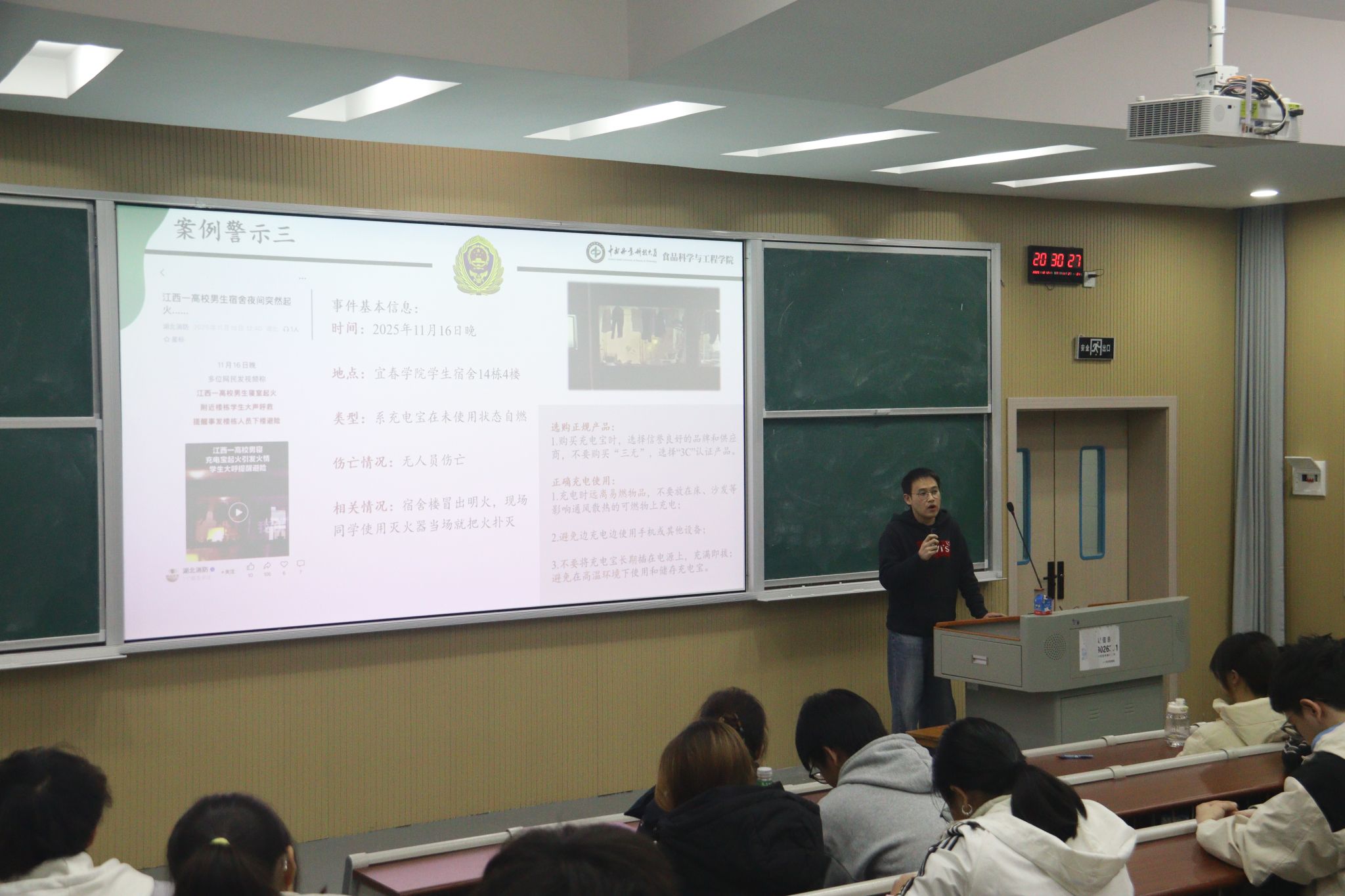 随后,陈思宇老师详细讲解了校园消防安全注意事项,重点强调了大功率用电器的危害及消防安全隐患,还就实验室火灾预防及处置、实验操作过程规范进行细致讲授,同时发生火灾后如何自救以及正确使用灭火器也与同学们进行分享,提醒同学们保持冷静,明辨方向,迅速撤离。最后,王玉璇老师对本次会议进行总结,再次重申安全教育的重要性,要求在场寝室长与班长及时向室友传达会议精神,并明确学校将对寝室开展不定期抽查,提醒各寝室严格遵守安全规定。