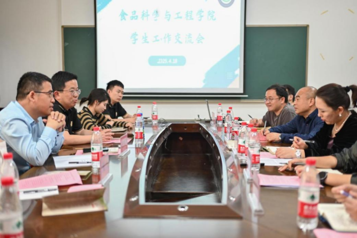 2025年4月18日下午, 江南大学、天津科技大学一行赴中南林业科技大学食品科学与工程学院开展学生工作交流会议。江南大学食品学院党委副书记、副院长李雷;天津科技大学食品科学与工程学院党委副书记聂慎德,学办副主任阎帅;食品学院党委书记周文化,党委副书记王玉璇,全体辅导员老师及学生代表参加此次座谈。