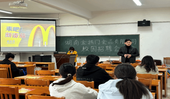 2025年11月3日下午,食品科学与工程学院联合湖南金拱门食品股份有限公司于神农楼B403开展了以“来吧,新番茄”为特色主题的校园招聘会。招聘会期间,宣讲人不仅介绍了企业的基本情况和发展历程,指出麦当劳在全球具有重要的品牌价值,还系统阐述了麦当劳的经营理念及发展过程中的创新成果。此外,麦当劳的晋升体系颇具特色,无论是专属的汉堡大学,还是菁英管培生计划,均为毕业生提供了多元化的自我提升平台。