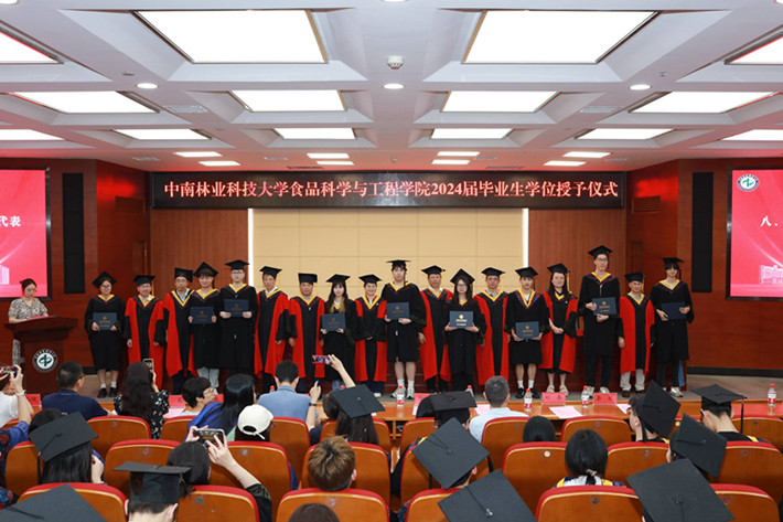 在授予学位决定和名单宣读完毕后,学院学术委员会教授代表为2024届毕业生依次拨穗正冠,授予学位,并合影留念,为同学们在中南林业科技大学的学习生涯画上了完满的句号。