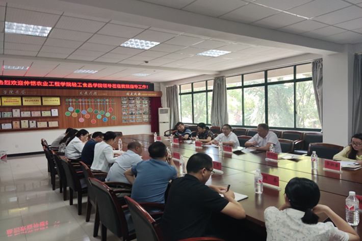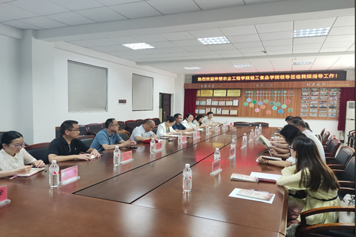 夏日炎炎,热情似火。8月23日仲恺农业工程学院轻工食品学院党委书记刘胜红同志、院长曾晓房教授等一行莅临我院,进行了一场旨在深化教育合作、共促学术繁荣的交流访问活动。我院党委书记周文化教授、院长任佳丽教授、张琳副院长、付湘晋副院长、吴伟副主任和三个系的主任及党支部书记参加了此次交流。双方学院代表齐聚一堂,不仅分享了各自学院的特色与发展历程,还就学科建设、人才培养、学生考研和就业以及党建工作等关键议题展开了深入的对话。
