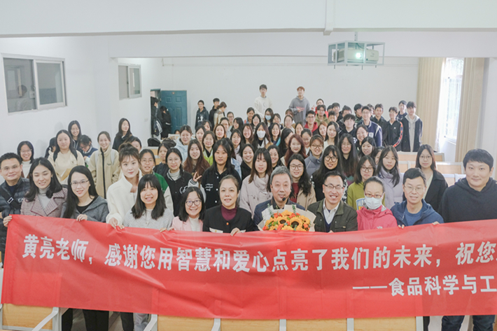 “今天的课就到此结束了,同学们,下课!”,11月7日,伴随着悠扬的下课铃声,我院黄亮老师在诚意楼108教室结束了20年教师生涯的最后一堂课。当最后一个知识点的讲解落下话音,在场的2021级食品科学与工程专业的同学们纷纷报以热烈的掌声,学院党委书记李婷及在场的专任老师们走上前,给黄亮老师送上饱含着祝福的鲜花与师生留言祝福本,向他致以崇高的敬意。随后,李婷书记、教学副院长付湘晋、粮食工程系主任杨英和在场老师、同学们一起与黄亮老师合影留念。