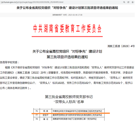 近期,全省高校党组织“对标争先”计划第三批项目评选结果公示,我院粮食工程系党支部书记杨英老师获评湖南省高校教师党支部书记“双带头人标兵”。