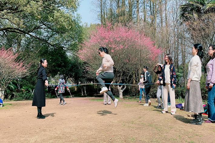 本次活动主要以趣味运动和登山越野为主。在参观游览周边环境之后,教职工分组开展了跳绳比赛,大家踊跃参与,赛场气氛十分浓烈,各队之间就集体长绳、单人跳绳等项目进行了一番激烈切磋。