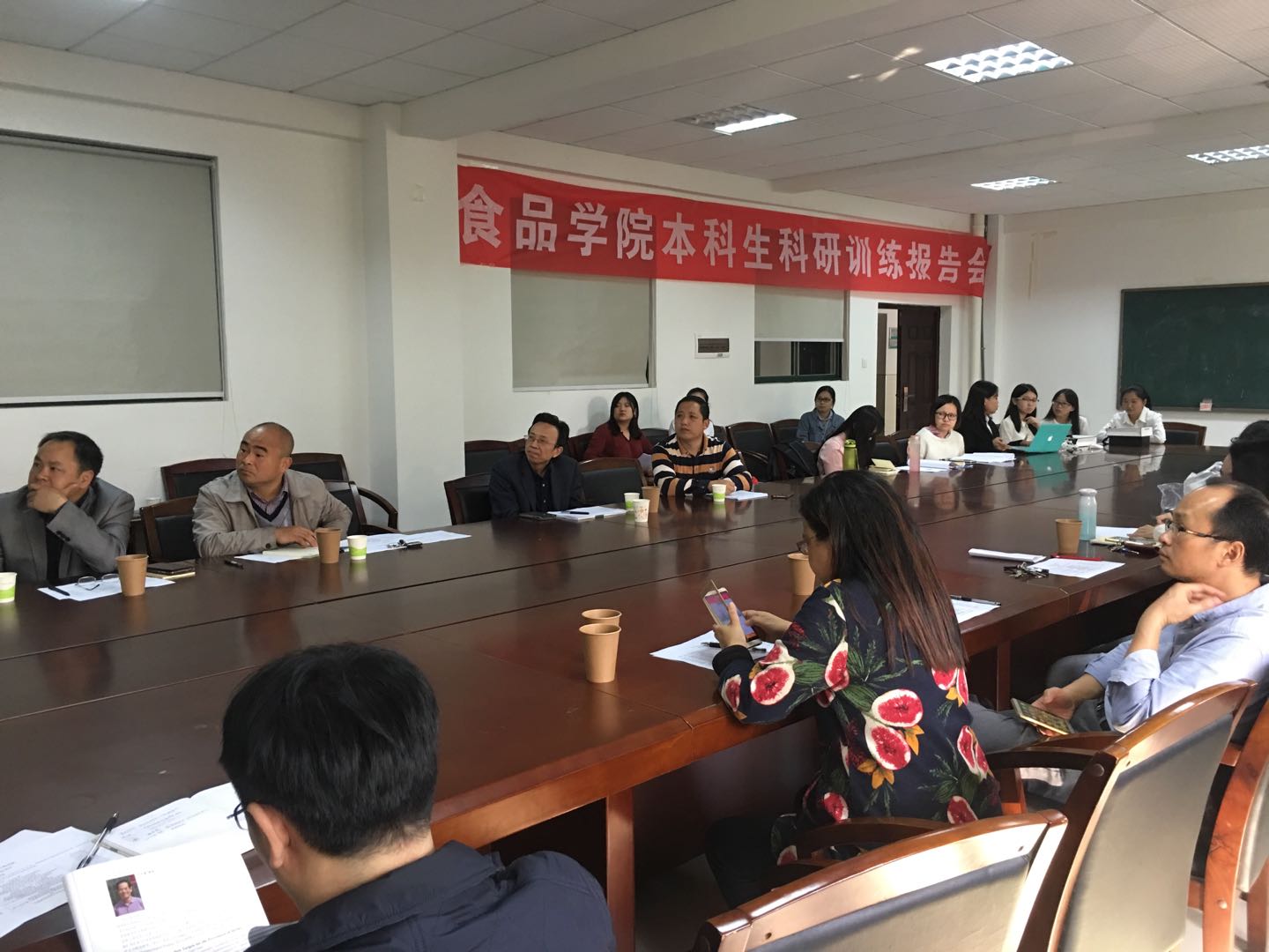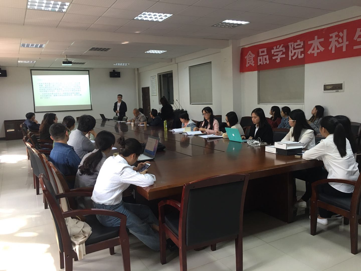 2017年11月3日下午14:00,食品科学与工程学院开展2017年度2014级本科科研训练汇报会,根据2016年10月学院确定徐帅哲同学主持“一种发酵型乳酸菌大米饮料的研制”等13个本科生科技创新基金,按照项目安排学院组织了本科生科技创新基金验收汇报会,学院聘请了教务处陈自勇副处长、创新创业学院祝海波院长和学院党委李婷书记、党委潘小杰副书记,周文化副院长担任评委,对项目进行了验收,各项目主持人对项目进行了详细汇报,各位指导老师详细汇报了学生完成项目基本概况,项目组完成优秀团队有:徐帅哲团队(粮食工程专业、指导老师吴跃博士)、陈子钰团队(食品科学与工程专业、指导教师孙术国博士)、谢慧团队(食品科学与工程专业、指导老师张琳博士)、魏晨曦团队(食品质量与安全专业、指导老师罗非君博士)、张东燕团队(食品科学与工程专业、指导老师黄铮昱博士)、姚怡然团队(食品科学与工程专业、指导老师黄亮教授)汤容团队(食品科学与工程专业、指导老师龚吉军博士)、王文飞(食品科学与工程专业、指导老师曹清明博士)和段思谦团队(食品科学与工程专业、指导老师丁玉琴博士)等9个团队。学院院长林亲录院长到会指导并与师生们合影留念。