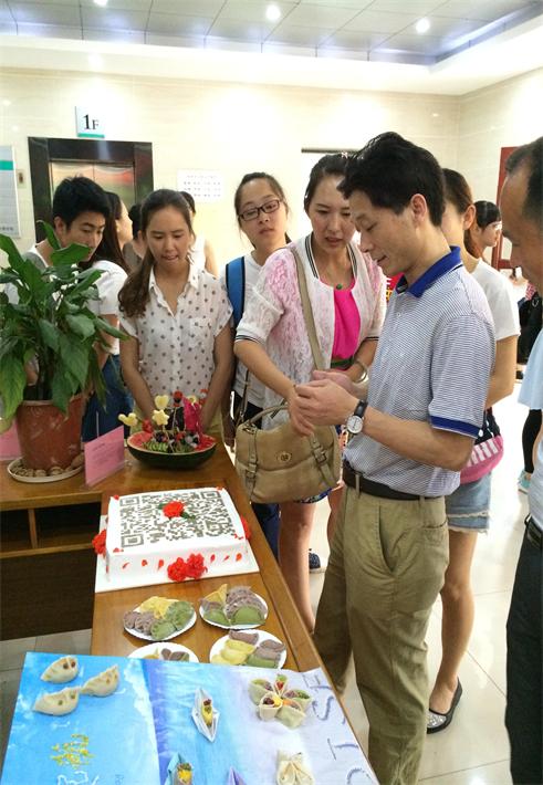 食品学院楼大厅里陈列着27件由不同年级的同学们亲手设计的创意作品,它们中有“舌尖上的密码”创意二维码蛋糕;有“茶禅一味”的抹茶糙米蛋糕,有寓意毕业生前程似锦的的“扬帆起航”、“速度与激情”等作品。从这些作品中能感受到同学们的创新精神和扎实的专业功底,作品展受到了前来参观的领导、老师和同学们的一致点赞。学生工作部李建兵部长在参观、品尝了学生制作的作品后,不住的点头称赞,“同学们的创意作品展,很有新意,既是传统文化的传承,也是食品新型技术的载体,更是食院同学们智慧的结晶”。