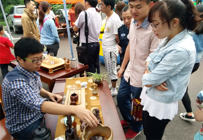 在“群贤雅聚,百家食尚”为主题的游园会现场,学生精心组织的美食制作、茶文化展、互动游戏三个版块吸引了络绎不绝的人群。芝士热狗、意大利面、西多士、工夫茶艺的表演、趣味横生的游戏,让围观者连连称赞、流连忘返。