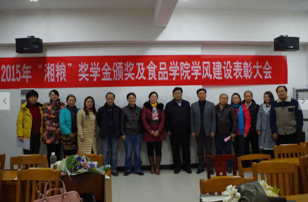 2015年12月19日晚7点,在食品科学与工程学院楼B403室举行了2015年“湘粮奖学金”颁发暨学院学风建设表彰大会。学院领导、各教研室主任、学生各班代表及全体受表彰的同学参加了会议。同时特邀到湖南省湘粮机械制造有限公司董事长杨扬先生、湖南省湘粮机械制造有限公司党委副书记任灼女士莅临会议。大会由副书记李婷主持。