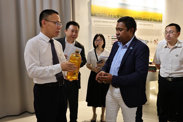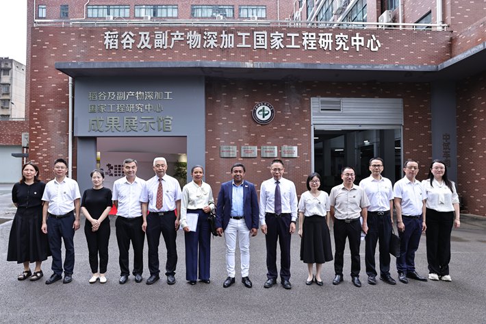 6月12日上午,马达加斯加塔那那利佛大学校长里沃阿里松·兰德里亚纳索洛(Rivoarison Randrianasolo)一行来稻谷及副产物深加工国家工程研究中心参观交流。塔那那利佛大学副校长雷里弗森(Rarivoson Nantenaina Volamahef),省科技厅科技合作处处长刘建元、科技合作处四级调研员刘帅兰,省农业科学院研究员肖贵,学校党委副书记王忠伟、副校长闫文德,科学研究部部长卿彦,稻谷及副产物深加工国家工程研究中心副主任吴伟,食品科学与工程学院副院长付湘晋、张琳以及副书记王玉璇陪同参观,学院教师杨英讲解。