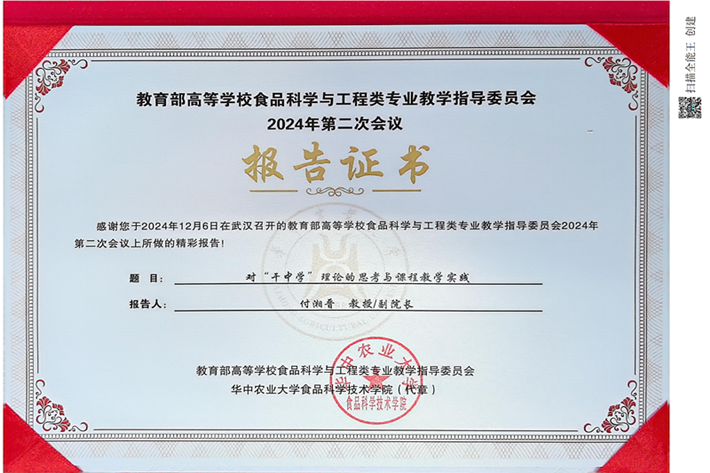 教育部高等学校食品科学与工程类专业教学指导委员会于12月6-7日在华中农业大学召开2024年第二次会议。我院付湘晋副院长应邀在大会上做题为《对“干中学”理论的思考与课程教学实践》的专题报告,分享我院国家一流课程《食品原料学》《食品工程原理》,省一流课程《食品生物化学》,校示范课程《食品化学》《食品物性学》的建设经验,受到与会领导、专家们的一致肯定。