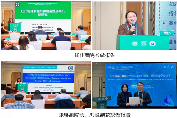 我院承办“食品功能因子挖掘与作用机制解析”分论坛,任佳丽院长带队参会,并主持分论坛。参会期间,任佳丽院长做了题为“The structure and antitumor mechanism of polysaccharides from Lactarius hatsudake Tanaka mushrooms”的报告,张琳副院长做了题为“Study on the Neuroprotective Effects and Molecular Mechanisms of Lycium ruthenicum Murray-Derived Exosomes”的报告,刘俊副教授做了题为“Regulation of Monascus pigments biosynthesis by energy-driven based on the interaction between G6PDH and MpigE proteins”的报告,2020级杨桥博士做了题为“Exploring the Anti-Cancer Potential of Lactarius hatsudake Tanaka Polysaccharides: Structural Characterization and Mechanistic Insights”的报告,2021级张雅丹博士做了题为“Lycium ruthenicum Murray Exosome-like Nanovesicles alleviatedAlzheimer’s disease-like symptoms induced by toxic Aβ protein intransgenic Caenorhabditis elegans through insulin DAF-16 signaling pathway ”的报告,2024级曾瑶英博士做了题为“基于GC-MS及OVA分析表皮蜡质对葡萄酒风味影响研究”的报告。充分展示了我院在食品生物科学与食品营养领域的最新研究成果。此外,学院产学研合作成果也在大会展厅展出,引起参会嘉宾的浓厚趣受到了大会一致好评。