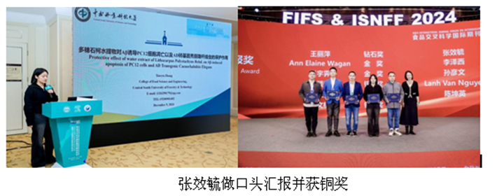 大会闭幕式上颁发爱思唯尔青年科学家奖、国际功能食品学会奖、学生竞赛海报展示奖、学生竞赛口头汇报奖等4个奖项。我院2023级张效毓硕士的“Protective effect of water extract of Lithocarpus Polystachyus Rehd. on Aβ-induced apoptosis of PC twelve cells and AD Transgenic Caenor-habditis Elegans” 口头报告被评为学生竞赛口头汇报铜奖。