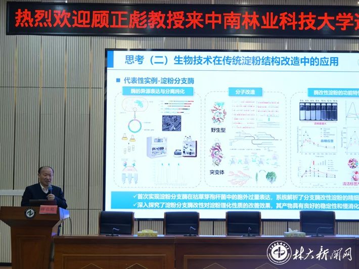 在报告会提问环节,顾正彪教授针对如何将淀粉研究与学校林业特色相结合、如何在海洋中获取淀粉资源、如何理解糖分摄入量与人脑记忆功能的关系等问题与现场师生进行了深入交流。