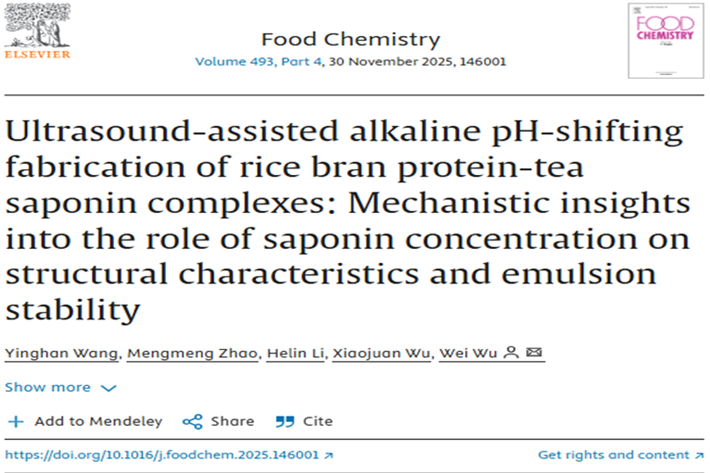 2025年8月,我院吴伟教授团队在国际食品Top期刊Food Chemistry(Q1,IF= 9.8)在线发表题为“Ultrasound-assisted alkaline pH-shifting fabrication of rice bran protein-tea saponin complexes: Mechanistic insights into the role of saponin concentration on structural characteristics and emulsion stability”的研究性论文。我院硕士研究生王英翰为第一作者,通讯作者为中南林业科技大学稻谷及副产物深加工国家工程研究中心吴伟教授。