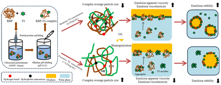 TS 与 RBP 之间发生共价(C-N 和 C-S 键)和非共价(氢键和疏水作用力)相互作用,其中以静态猝灭为主。适度TS 浓度(6.25 mg/mL)提高了RBP-TS 复合物的游离巯基含量和ζ-电位绝对值,降低了二硫键含量、表面疏水性和平均颗粒粒径。TS 的加入促进了 RBP 亚基之间非二硫键的形成。在适度的 TS 浓度下,RBP-TS 复合物乳液的流变特性得到了增强,表观粘度和储能模量达到最大值,形成了致密的界面膜。与未加TS的RBP 相比,适度的 TS 浓度可提高RBP的乳化活性和乳化稳定性。过高的 TS 浓度(> 6.25 mg/mL)会导致复合物乳液粘弹性下降,降低乳液的稳定性。总体而言,适度的 TS 浓度可通过调节 RBP-TS 复合物的空间结构来提高乳液稳定性。这项研究为通过 TS 改性提高植物蛋白乳化稳定性提供了新思路。未来,RBP-TS 复合物在封装和输送生物活性物质方面的应用仍有待探索。