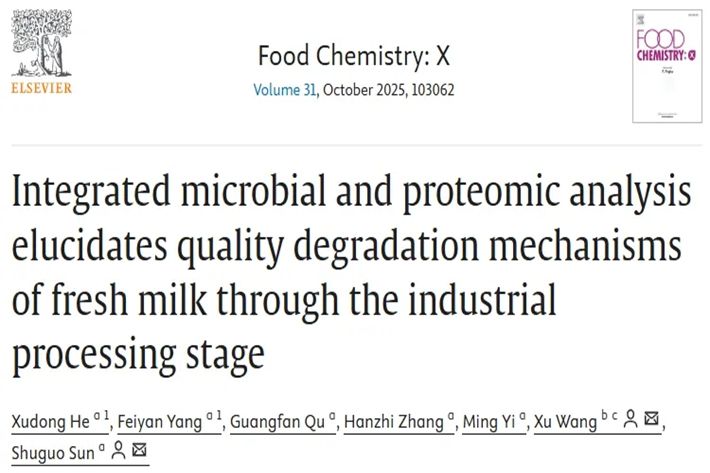 2025年9月,中南林业科技大学孙术国教授团队联合广东省农业科学院王旭研究员在国际食品Top期刊《Food Chemistry: X》(Q1,IF 8.2 )发表题为“Integrated microbial and proteomic analysis elucidates quality degradation mechanisms of fresh milk through the industrial processing stage”的研究性论文。孙术国教授和王旭研究员为通讯作者,中南林业科技大学食品科学与工程学院24级博士研究生何旭东为第一作者。