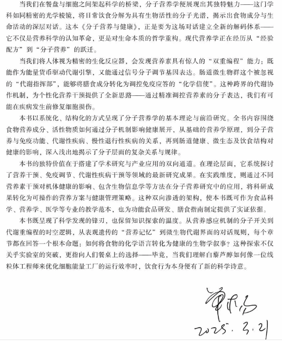 中国工程院单杨院士以深厚的学术积淀与前瞻的科研视野,为本书作序把关,并高度评价本书为解析食物成分与生命活动对话的关键钥匙,为现代食品营养学向科学化、系统化、精准化发展提供了重要的理论支撑和教学基础。