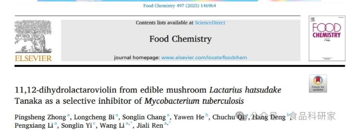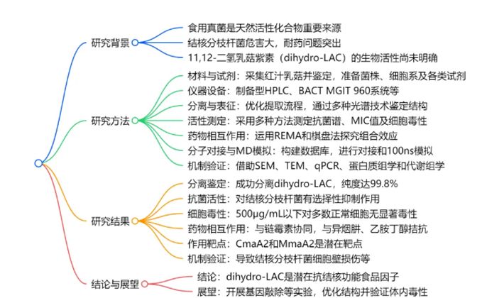 食用真菌作为天然活性化合物的重要来源,富含多糖、多酚、黄酮、萜类和多肽等多种成分,其中红汁乳菇(Lactarius hatsudake Tanaka)作为红菇科野生食用蘑菇,其营养成分与生物活性成分已得到广泛研究,此前研究已发现其含有的多糖具有抗癌作用,其他生物活性成分也展现出抗菌、抗炎和抗氧化等特性。在抗结核领域,食品来源的天然化合物(如多酚类的姜黄素、黄酮类、肽类及萜类)被证实具有抗结核活性,其中倍半萜类作为萜类的一个分支,广泛存在于真菌、植物和海藻中,11,12 - 二氢乳菇紫素(dihydro-LAC)作为一种倍半萜,虽早年间已从食用蘑菇中分离发现,但其一直接受关注较少,生物活性尚未明确。而结核分枝杆菌(Mycobacterium tuberculosis)作为引发结核病的病原体,可通过气溶胶飞沫、未经巴氏消毒的牛奶及受污染肉类传播,每年导致约 1000 万新增病例及 150-200 万死亡病例,且耐药菌株的出现进一步加剧了感染防控与治疗难度,因此开发源于食用资源、生物安全性高的抗结核活性化合物,成为控制结核分枝杆菌感染、推动全球结核病消除工作的重要方向,这也为探索 dihydro-LAC 的抗结核活性提供了研究意义与现实需求。