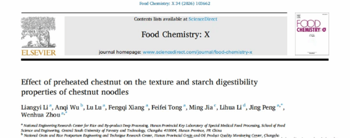 近期,我院彭晶副教授和周文化教授(通讯作者)等在期刊《Food Chemistry:X》(IF:8.2)上发表了题为“Effect of preheated chestnut on the texture and starch digestibility properties of chestnut noodles”的论文。