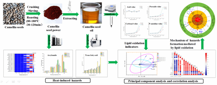 油茶籽是我国重要的木本油料资源,由其制取的油茶籽油富含不饱和脂肪酸与生物活性成分,具有较高的营养与经济价值。在油茶籽油加工中,烘焙作为至关重要的预处理环节,虽能提升出油率并赋予油脂特征风味,但若工艺参数设置不当,剧烈的热处理同样会加速油脂氧化、异构化及美拉德反应,进而诱发反式脂肪酸、丙烯酰胺、杂环胺、多环芳烃等多种热诱导有害物的生成,对产品品质安全构成潜在威胁。目前,相关研究多聚焦于单一品质指标或个别有害物的生成规律,缺乏对有害物形成与油脂氧化劣变之间系统关联的深入探讨,致使难以从源头上通过调控氧化进程同步抑制多种有害物产生,这已成为实现油茶籽油高品质、低风险加工的主要技术瓶颈。因此,本研究通过深入解析烘焙过程中油脂氧化稳定性与多类热诱导有害物形成的耦合机制,为优化油茶籽精准热加工工艺提供了新的理论依据与实践支撑。