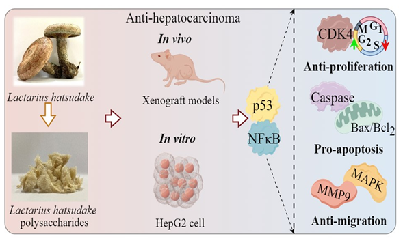 癌症,作为全球范围内的主要死亡原因之一,其发病率和死亡率的急剧上升已经引起了全球对无毒、高效癌症治疗手段的迫切需求。2020年全球新发癌症病例约1930万,死亡近1000万,预计到2040年将增长47%。当前癌症治疗手段如手术和化疗存在耐药性、转移、不完全手术切除和化疗药物毒性等问题,导致患者的治疗效果受限且遭受严重副作用。本研究聚焦于天然活性多糖,尤其是食用菌来源的多糖,因其较低的毒性和较少的副作用而在癌症治疗中显示出巨大潜力。红汁乳菇(Lactariushatsudake Tanaka)多糖(LHP)已被证实在体外对肿瘤细胞具有细胞毒性,并且可能通过影响关键信号通路NFκB和p53发挥抗癌作用。本研究旨在深入探讨LHP的体内抗癌活性及其通过NFκB和p53途径的抗癌机制,为LHP在抗癌策略中的应用提供理论基础,并评估其作为HCC治疗手段的潜力。