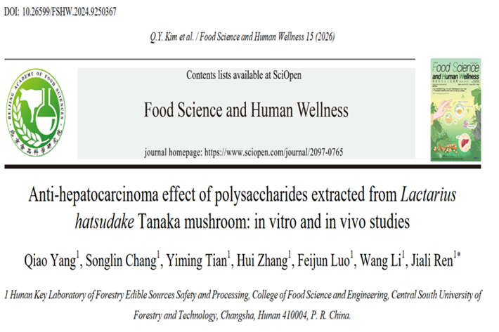 2024年8月,任佳丽教授团队在国际食品Top期刊《Food Science and Human Wellness》(Q1,IF: 5.6)发表题为“Anti-hepatocarcinoma effect of polysaccharides extracted from Lactariushatsudake Tanaka mushroom: in vitro and in vivo studies”的研究性论文。中南林业科技大学食品科学与工程学院、林产可食资源安全与加工利用湖南省重点实验室博士研究生杨桥为第一作者,任佳丽教授为通讯作者。