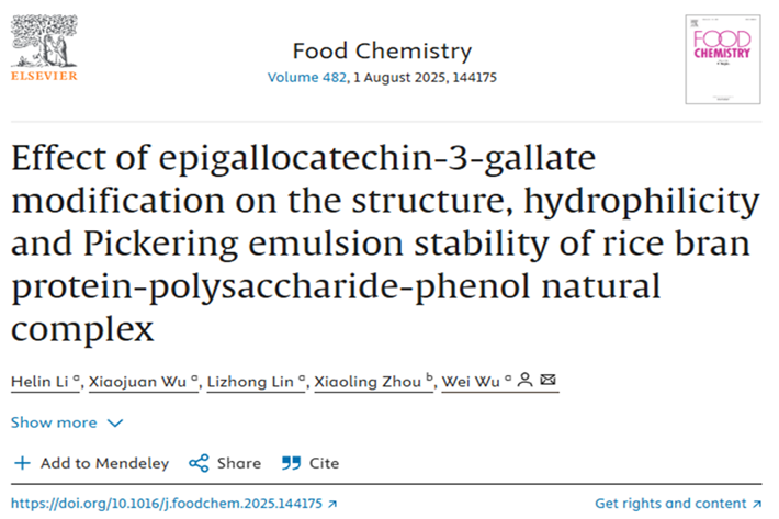 202541日,我院吴伟教授团队在国际食品Top期刊Food ChemistryQ1IF=8.5)在线发表题为“Effect of epigallocatechin-3-gallate modification on the structure, hydrophilicity and Pickering emulsion stability of rice bran proteinpolysaccharide-phenol natural complex”的研究性论文。我院博士研究生李鹤林为第一作者,通讯作者为稻谷及副产物深加工国家工程研究中心吴伟教授。