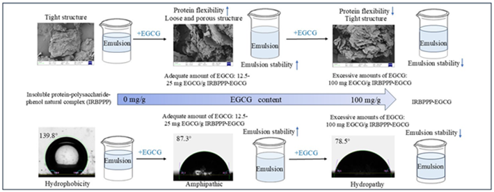 随着消费者对“标签友好型”产品的需求日益增长,人们开始转向有效利用食品级副产品,将其作为可持续发展的一部分。近年来,作为提取油脂、植物蛋白和多糖的副产物,不溶性蛋白质-多糖-酚天然复合物被用作乳液稳定剂。然而,天然复合颗粒具有高度疏水的特性,这会阻碍天然络合颗粒在油水界面的吸附,不利于天然复合颗粒的乳液稳定性。研究发现,添加多酚可增加颗粒的亲水性,从而大幅提高乳液稳定性。然而,现有的关于使用多酚改变颗粒亲水性的研究大多集中在分离的蛋白质或多糖上,还没有研究探讨过多酚对从农产品加工副产物中提取的天然蛋白质-多糖-酚复合物的乳液稳定性影响。因此,本文旨在评估EGCG修饰条件下米糠蛋白-多糖-酚天然复合物(IRBPPP)的结构、亲水性和乳液稳定性,乳液中界面吸附和界面未吸附蛋白质的柔性和结构,并探讨多酚改性影响蛋白-多糖-酚天然复合物皮克林乳液稳定性的深层原因。