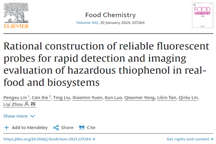 2024年1月30号,我院周礼义副教授团队在食品领域国际期刊《Food Chemistry》(Q1, IF=8.8)在线发表题为“Rational construction of reliable fluorescent probes for rapid detection and imaging evaluation of hazardous thiophenol in real-food and biosystems”的研究性论文。我院2022级在读硕士生林芃旭为第一作者,通讯作者为周礼义副教授。