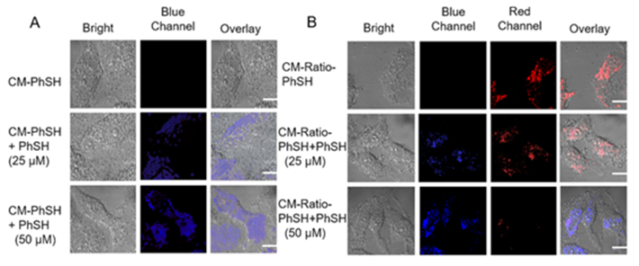 本工作开发了用于快速检测PhSH的荧光探针CM-PhSH和CM-Ratio-PhSH,分别实现了食品、环境和生物系统中PhSH的实时监测和成像分析。两种探针均基于香豆素荧光团与α、β不饱和双键的亲核加成,以特异性识别PhSH。它们具有高灵敏度和优越的选择性。与CM-PhSH相比,CM-Ratio-PhSH作为比率荧光探针更适合用于真实生物样品的荧光成像。在PhSH存在下,用CM-PhSH和CM-Ratio-PhSH处理的HeLa细胞的荧光图像在蓝色通道和红色通道中均显示出明显的荧光信号变化。此外,CM-Ratio-PhSH已成功应用于真实样品和生物系统中PhSH的成像,因此CM-Ratio-PhSH有望为食品和生物医学相关领域的研究做出贡献。