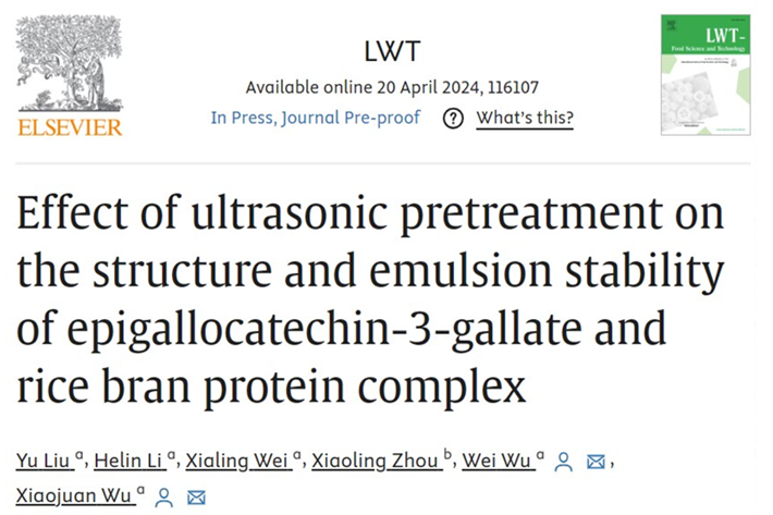 2024年4月,我院吴伟教授团队在食品领域国际期刊LWT - Food Science and Technology(Q1, IF=6.0)在线发表题为“Effect of ultrasonic pretreatment on the structure and emulsion stability of epigallocatechin-3-gallate and rice bran protein complex”的研究论文。我院硕士研究生刘雨为第一作者,通讯作者为稻谷及副产物深加工国家工程研究中心吴伟教授和吴晓娟高级实验师。