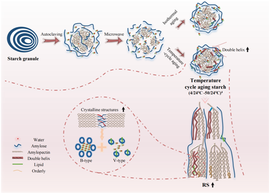 抗性淀粉(RS)指在小肠中未被消化吸收的淀粉组分,对于预防糖尿病、促进肠道健康以及降低心血管疾病风险具有重要作用。在抗性淀粉的多种类型中,回生淀粉(RS3)因其卓越的理化特性(出色的抗酶性、安全性和稳定性)而受到特别关注。回生是淀粉在冷却和储存过程中的一个不可避免的现象,对于制备RS3至关重要。这一过程的本质是淀粉分子在糊化后重新排列,形成有序的微晶结构。根据聚合物结晶的经典动力学模型,淀粉的回生过程包括三个连续阶段:(i) 成核;(ii) 结晶生长;(iii) 成熟或晶体的完善。结晶速率主要受前两个阶段的影响。已有研究表明,这些过程受到多种内部因素(如直链淀粉和支链淀粉的比例,以及其他膳食成分)和外部因素(如温度、回生时间和水分含量)的影响。