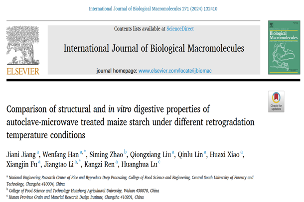 2024年5月31号,我院李江涛、韩文芳副教授团队在食品领域国际期刊《International Journal of Biological Macromolecules》(Q1, IF=7.7)在线发表题为“Comparison of structural and in vitro digestive properties of autoclave-microwave treated maize starch under different retrogradation temperature conditions”的研究性论文。我院2020级硕士生江佳妮为第一作者,通讯作者为稻谷及副产物深加工国家工程研究中心李江涛副教授和韩文芳副教授。