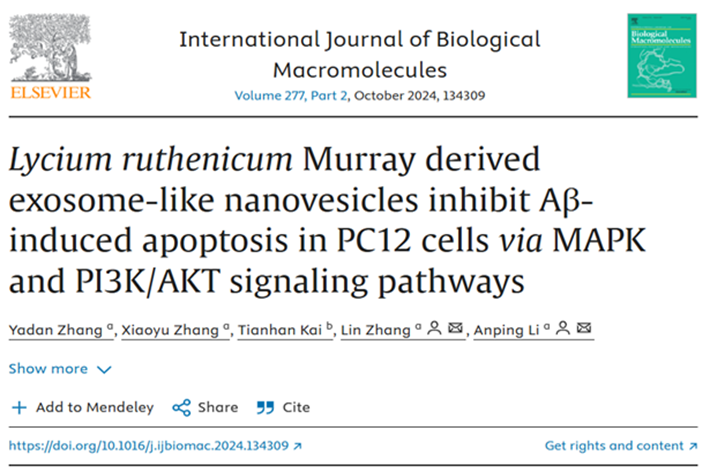 2024年7月31日,我院张琳副教授团队在食品领域国际期刊《International Journal of Biological Macromolecules》(Q1, IF=7.7)在线发表题为“Lycium ruthenicum Murray derived exosome-like nanovesicles inhibit Aβ-induced apoptosis in PC12 cells via MAPK and PI3K/AKT signaling pathways”的研究性论文。中南林业科技大学食品科学与工程学院、特医食品加工湖南省重点实验室2021级在读博士生张雅丹为第一作者,张琳副教授和李安平教授为通讯作者。