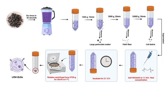 传统上,植物ELNs的提取依赖于差速超速离心法,然但该技术成本高且处理量有限,不利于大规模生产。近期,研究团队采用了一种基于聚乙二醇的沉淀法,成功从黑果枸杞(LRM)中分离出ELNs。该方法不仅避免了昂贵的超速离心设备,还保证了与传统方法相似的提取效果,具有更高的经济性和可扩展性。